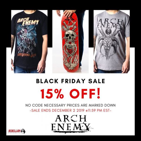 It's your favorite time of the year again! ? Get 15% off all Arch Enemy merch at Rebellion Republic - only valid until Dec. 2, 2019! NO CODE NEEDED. Discounts will appear in the checkout screen automatically. PLUS, if you order over $100, you'll get a free, LIMITED Arch Enemy tote bag FOR FREE (while supplies last: enter "ENEMYBAG" at the checkout)!
