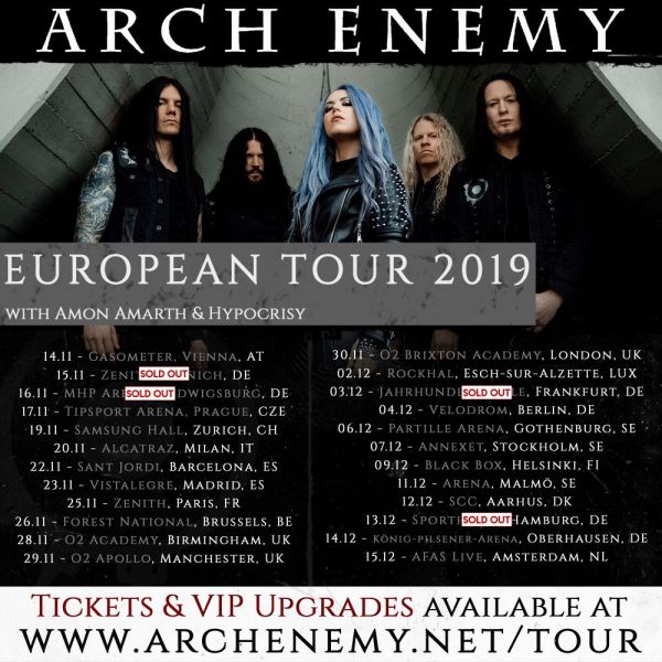 Our upcoming EUROPEAN TOUR 2019 with Amon Amarth & Hypocrisy stars in 10 days! Get your tickets and VIP upgrades at www.archenemy.net/tour and we'll see you soon!