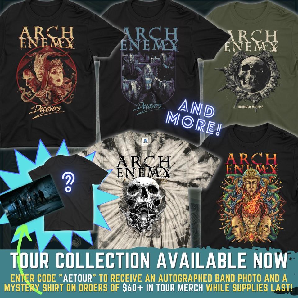Enter code "AETOUR" on orders $60+ to receive an autographed band photo AND a mystery Arch Enemy shirt while supplies last! You can't choose the mystery shirt, but we'll try to match your size as best as stock allows. Select items are further discounted until July 5th.
